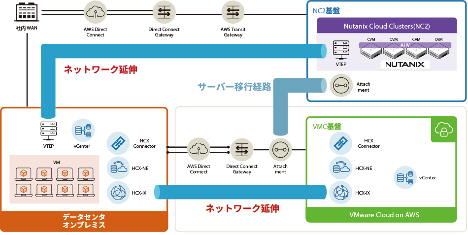 特に、IPアドレスの変更をせずに移行を実現するためのキーポイントとなったものが「3拠点のネットワーク延伸」です。本プロジェクトは、データセンター・VMC・NC2の3拠点でネットワーク延伸を実現し、VMC環境のサーバーIPアドレスを変更することなく、NC2環境へ移行しています。