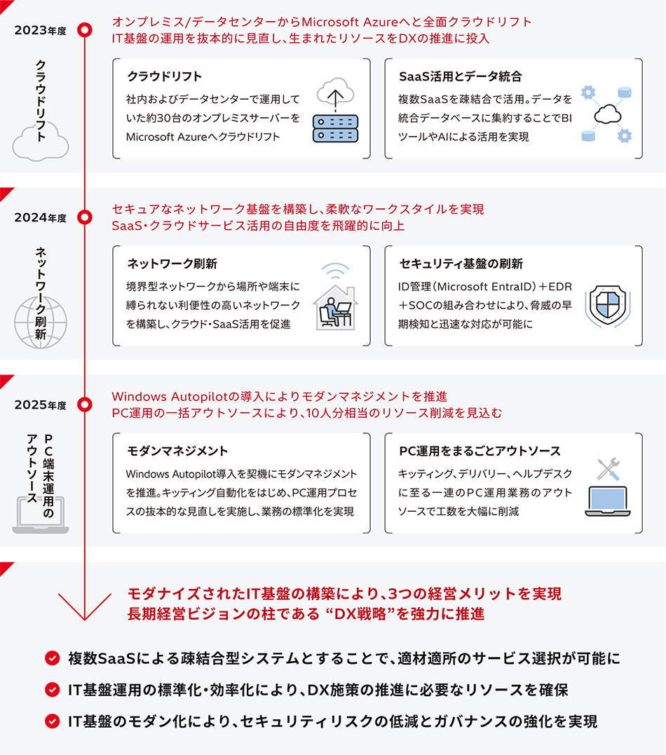 こうした課題の解決を支援したのが、40年来のパートナーである日立システムズでした。両社はIT基盤の運用・保守業務の効率化を軸に、クラウド、ネットワーク、PC端末の3領域を対象とした改革を年度ごとに段階的に進めていきました。