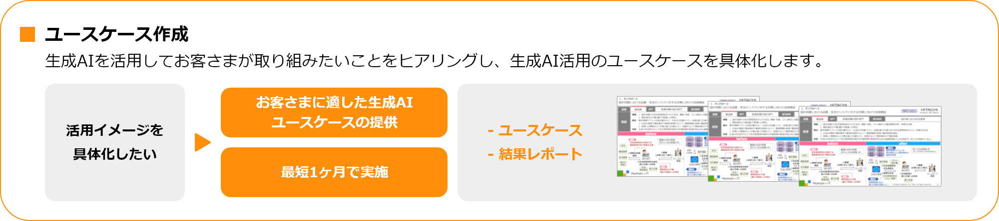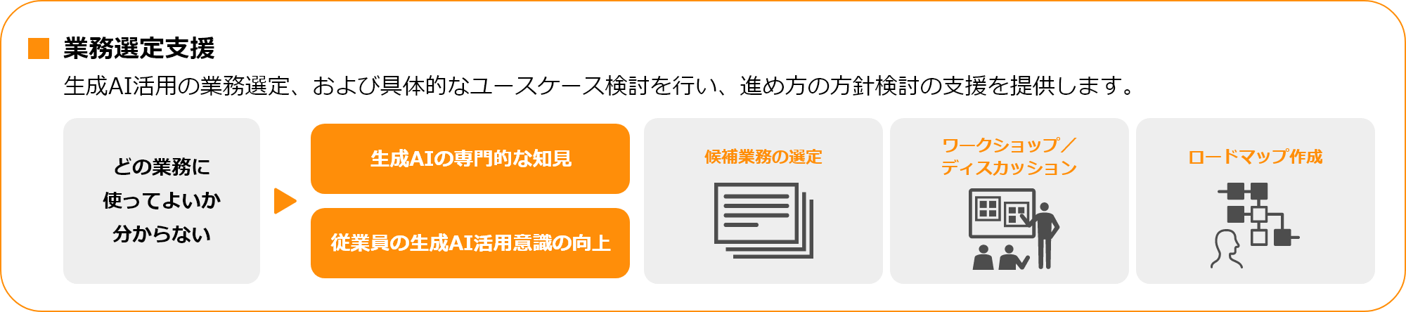 生成AIの活用にあたり、業務の洗い出しと効果適正の確認を行い、具体的なユースケースを一緒に作成します。