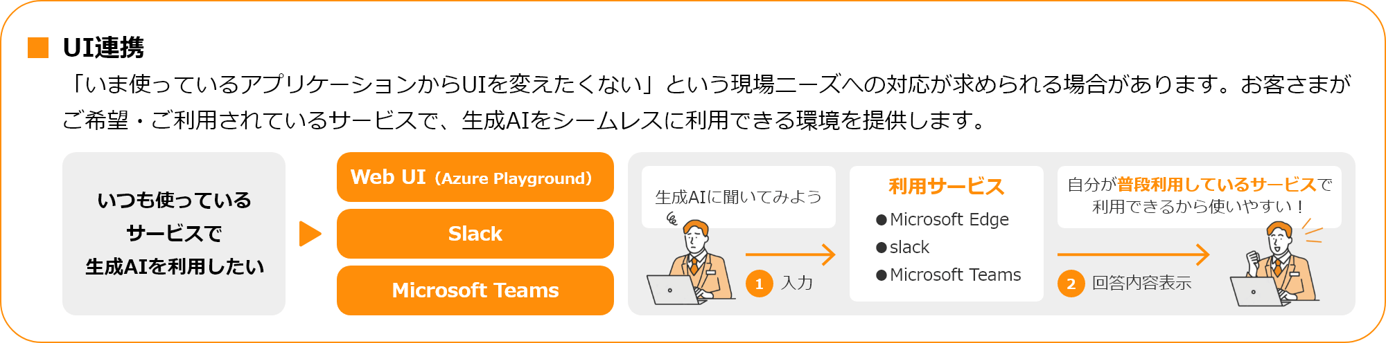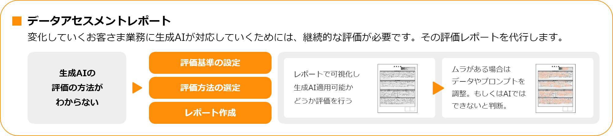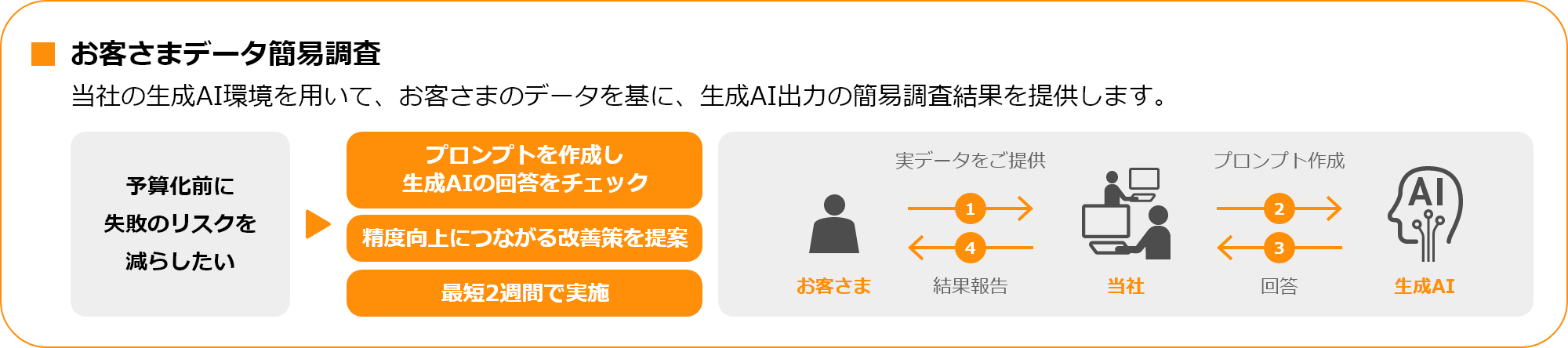 お客さま専用の検証環境を提供する、あるいは当社の生成AI環境を用いて、生成AIの効果検証を行います。