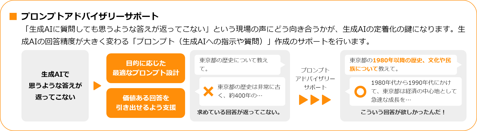 お客さまの持続的なビジネス成長をめざし課題・ニーズに合わせた段階的な生成AI導入・活用をお手伝いします。まずはお気軽に相談ください。