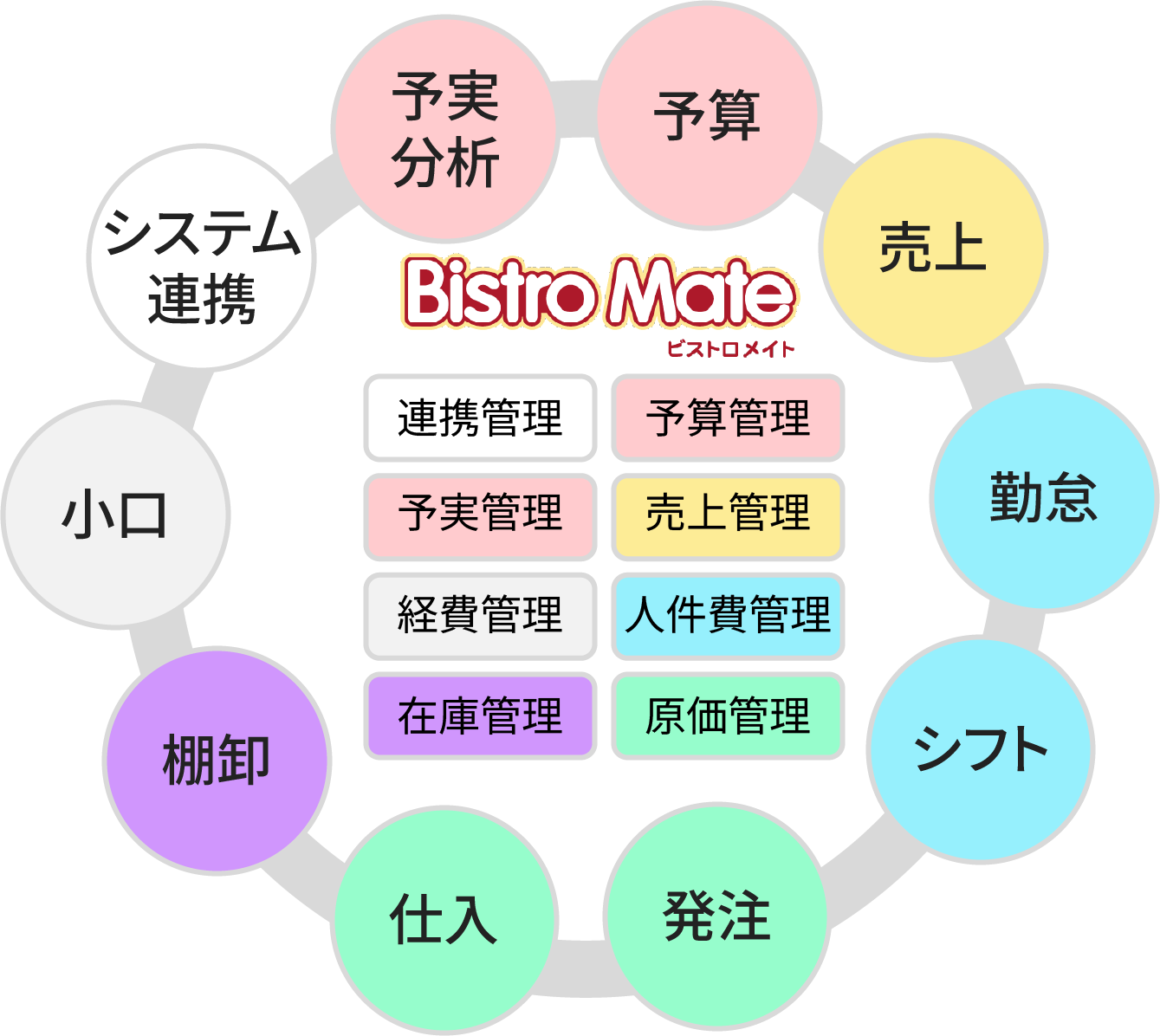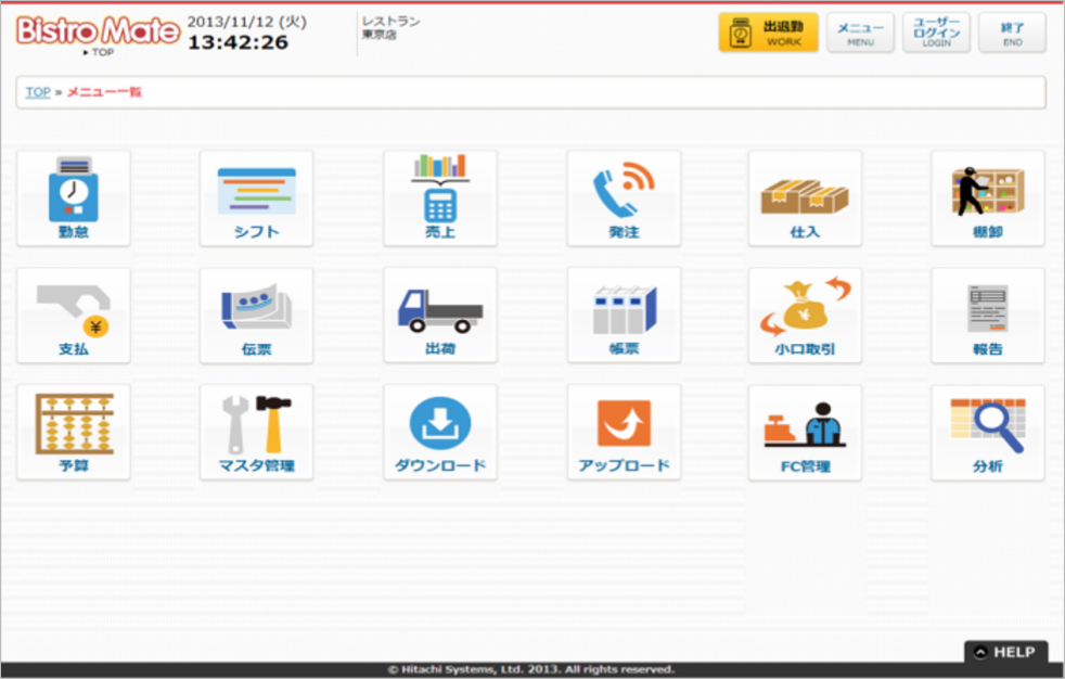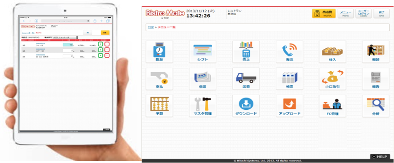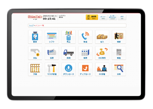 ビストロメイトは、売上・食材(受発注、棚卸)管理・勤怠・日報などの飲食店舗・本部・仕入先で必要となる業務をシステム化します。システム化することで、属人的な仕事の進め方から、“誰でも同じようにできる”=業務の標準化につながり、業務品質の向上と高いレベルでの維持を図ることができます。
