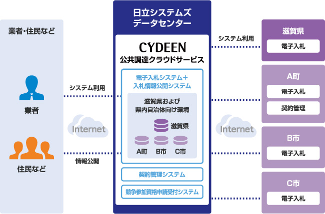 滋賀県は、独自導入による「電子入札システム」を2006年より運用していたが、システムの中核となる「電子入札コアシステム」のバージョンアップに伴い、現行システムに改修の必要が生じていた。そこで県は、バージョンアップへの対応と同時に、県内市町から要望があがっていたシステムの共同利用に対応するため、電子入札システムの再構築を決断。システム要件を綿密に定めた選考の結果、共同利用を効果的に推進できる点を評価し、日立システムズのクラウド型パッケージシステム「CYDEEN電子入札システム」の採用を決定した。