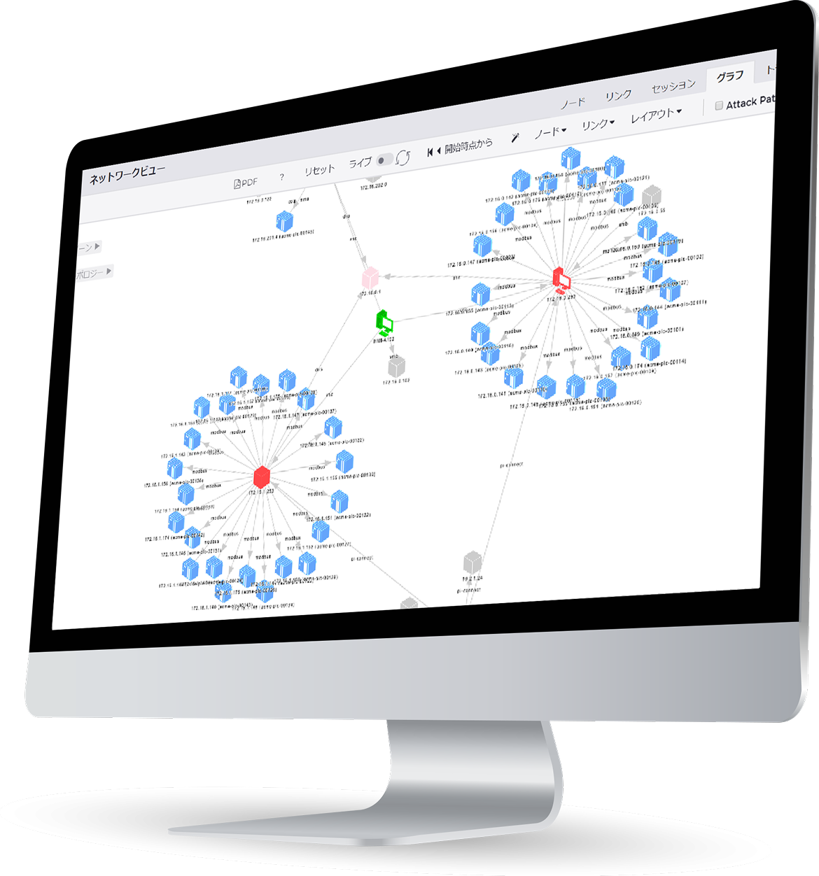 つながっている端末や機器を把握することができます。資産の洗い出しや管理が可能です。ベンダー名、製品名、シリアル、ファームウェア情報、プロトコル名、IP、ぜい弱性情報なども可視化します。