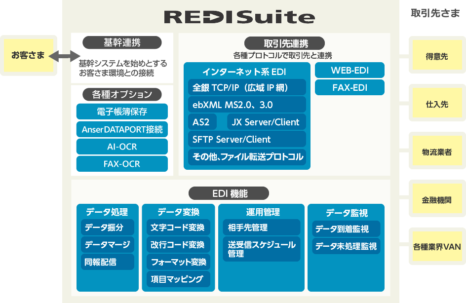 REDISuite/EDIセンターサービスは、多彩な通信手段を提供し、さまざまな接続先(取引先、VAN会社、業界VANなど)との通信を可能にします。拡張性の高いサービスであるため、サービス導入後の取引先追加にも柔軟に対応します。