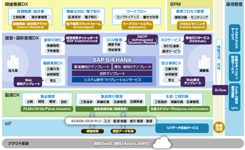 当社は、SAP ERPを中心にさまざまな製品、サービスを提供し、お客さまの業務やDX課題などの解決を支援します。SAPは「Fit To Standard」を意識して各種テンプレートを拡充し、SAPに無い、もしくは弱い機能は、周辺システム(当社SEが導入)を用意しています。また当社の強みであるインフラサービスやシステム保守サービス、設備連携などもサービスに組み込み、幅広くサービスの提供をします。