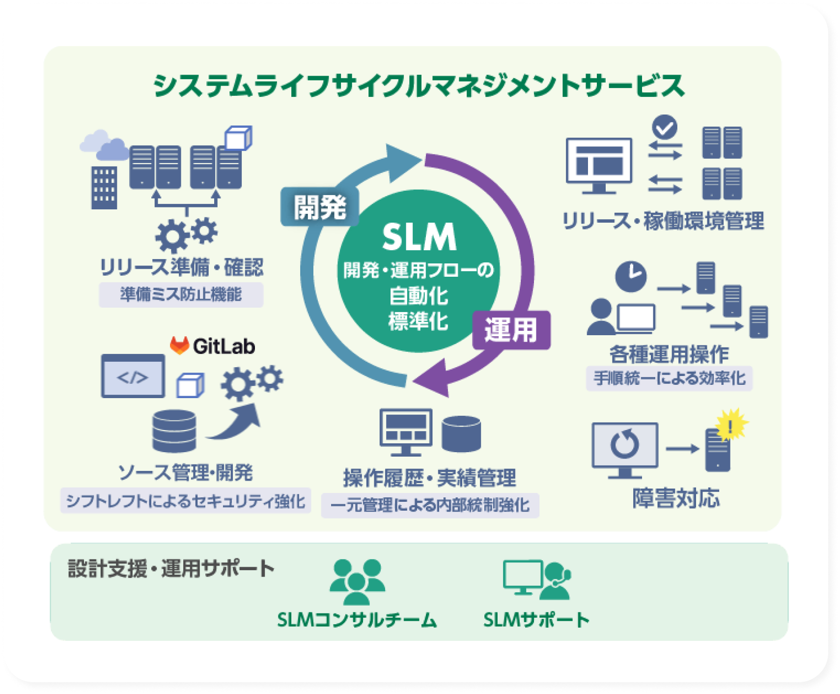 お客さまのシステム運用プロセスおよび課題の整理・分析を行い、SLMを取り入れた効率的な運用方法を提案します。スモールスタートでの運用展開も可能です。