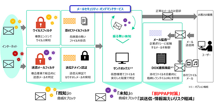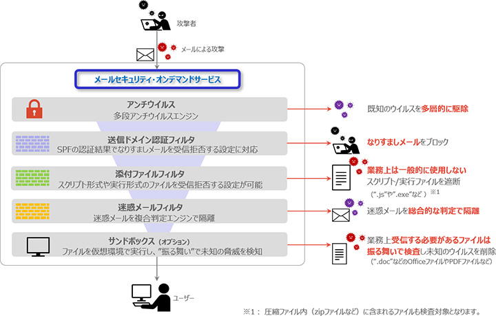 迷惑メールからランサムウェア、標的型メール攻撃まで、メール受信時における脅威メールを多層化したフィルタリング機能により極小化。振る舞いで検知を行うサンドボックスにより未知の脅威にも対応。