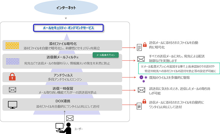 メール監査やDOX連携機能により誤送信・情報漏えいリスク軽減にも対応。