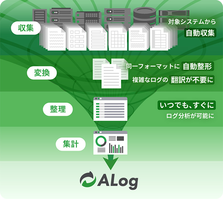 | ログ収集 | オンプレミスからクラウドまで、カンタンにログを自動収集できるように、ALogからログ出力のための監査設定が可能。クラウドサービスでAPI仕様変更があったときも自動アップデートで対応。 |