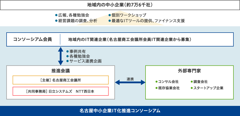 こうした中、日立システムズは地域のIT企業を会員とした共同事業体(コンソーシアム)「名古屋中小企業IT化推進コンソーシアム(Pit-Nagoya)」を通じて、IT企業の先にいる地元中小企業の業務効率化・高度化を推進することで、名古屋市ひいては日本の経済発展に貢献しています。