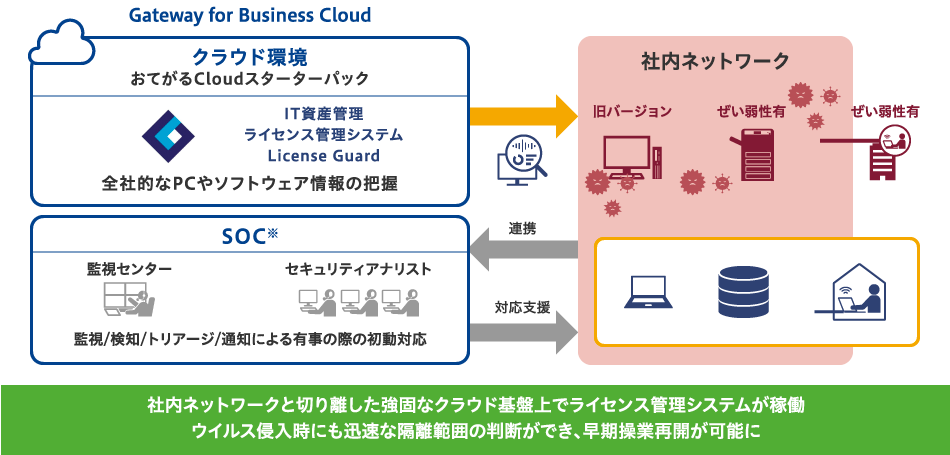 さらにクラウド版「License Guard」は、社内ネットワークとは別のクラウド基盤上で稼働しており、クラウト基盤には日立システムズのマルチクラウドソリューション「Gateway for Business Cloud」のサービス群からクラウド基盤サービス「おてがるCloudスターターパック」を採用しています。これによって24時間365日の監視運用が可能となるほか、社内ネットワークへのウイルス侵入などによるセキュリティインシデント発生時にも、ウイルスの影響を受けずに影響範囲分析を行うことができるため、早期操業再開が可能となり、お客さまの事業継続を支援します。