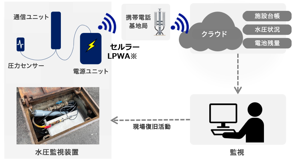 これによって、人の手で実施してきた水圧管理業務におけるデータの現場回収業務を省力化できたほか、配水管破損の原因のひとつである減圧弁故障を遠隔で、早期に、正確に検知することができ、故障発生時の修理・応急処置を早期実施することができるようになりました。