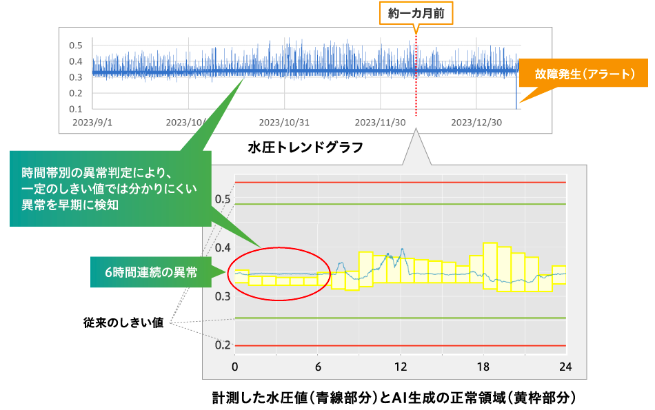 その結果、ある減圧弁では、従来の方法で故障が確認された約1カ月前から水圧値が上方に超過していたことが分かり、AI分析を活用すれば故障の予兆検知ができることが証明されました。故障の予兆検知ができれば、故障発生の未然防止や、水道局員あるいは減圧弁メーカーによるメンテナンス作業の効率化などが見込めます。日立システムズでは、水供給の安定化をめざす神戸市水道局をはじめとする全国の水道事業体を支援するため、今回の研究における検証をさらに進めて、2025年度からのサービス提供開始をめざしています。
