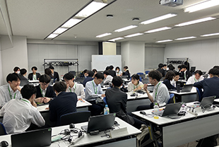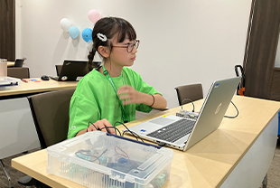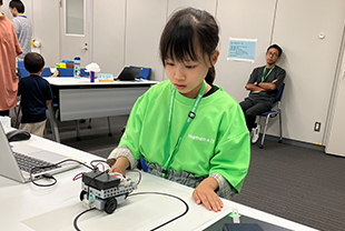 従業員の家族が職場を訪れるファミリーデーにて、子どもたち向けにIT教室を実施。車型ロボットを組み立て、ロボットが動くようにプログラムを作りました。慣れないPC操作に奮闘しながらも、子どもたちはプログラミングやものづくりの面白さを体験しました。
