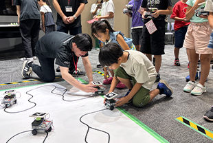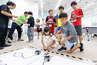 子ども達は、車型ロボットを組み立て、プログラミングを通じて動かし、AI・センサー・カメラを用いたレースで盛り上がりました。