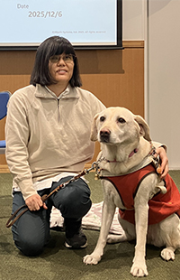 セミナーでは、盲導犬の仕事や視覚障がいについて、動画やクイズを交えながら、小さなお子さんからご高齢の方まで幅広い参加者に分かりやすく説明しました。参加者のみなさんは熱心に耳を傾け、盲導犬に関する本の紹介やブックリストにも興味を持ってくださいました。さらに、盲導犬のダレンとのふれあいタイムでは、その穏やかで人なつっこい様子から「大きくても怖くないよ」「人と接することが大好き♡」ということを来場者のみなさんに知っていただける機会となりました。